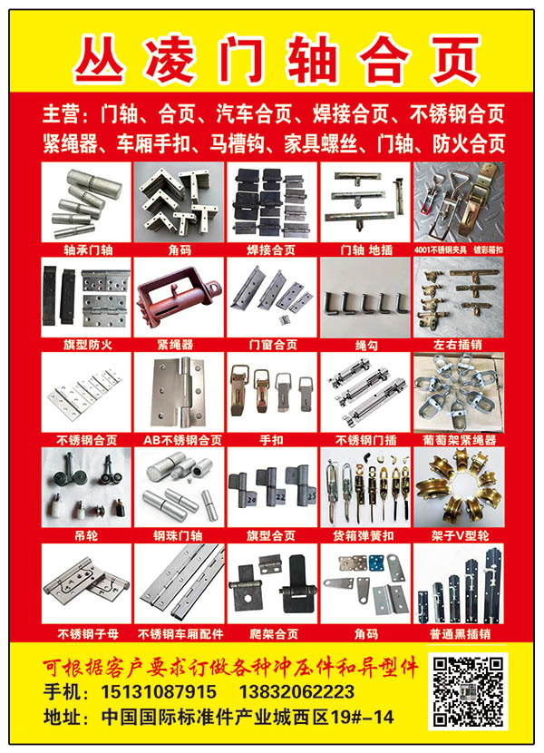 主营:门轴、合页、汽车合页、焊接合页、不锈钢合页 紧绳器、车厢手扣、马槽钩、家具螺丝、